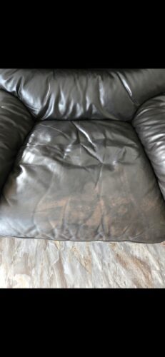 Picture of leather chair cushion showing discoloration and wear along the front edge and piping
